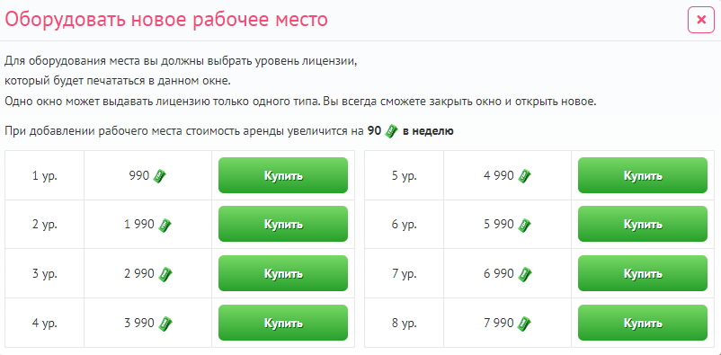 Одно рабочее место может выдавать лицензии только одного уровня! Аренда одного рабочего места стоит 90 руб. / неделю.
