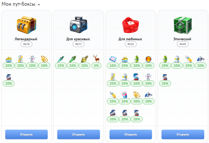 После нажатия на кнопку вы увидите, какие товары вам выпали в каждом наборе, а на странице "Мои усилители" будет полный список всех имеющихся у вас товаров.