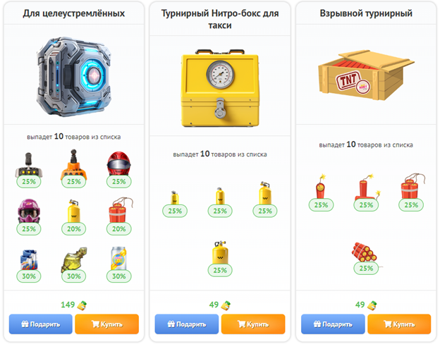 В каждый лут-бокс входят полезные предметы, которые совершенно точно пригодятся вам во время: выполнения заказов, турниров, гонок. В лут-боксе обозначено наличие и количество предметов которые Вы сможете получить при покупке лут-бокса.