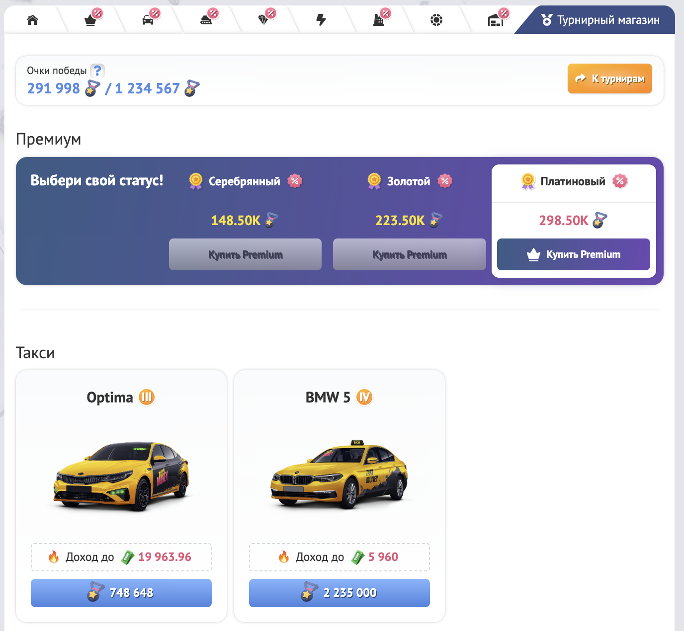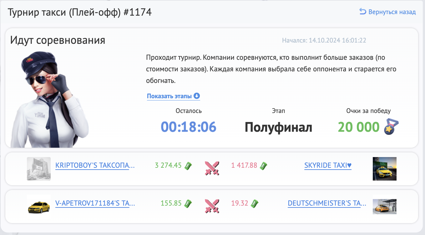 Турниры — это ежедневные соревнования между Таксопарками и Горными компаниями. Во время проведения Турнира компании не просто выполняют заказы или добывают руду, но и соревнуются с другими участниками Турнира. А по результатам всех этапов участники Турнира набирают Очки победы, которые можно потратить на ценные товары в Турнирном магазине или на бонусы для своей компании.