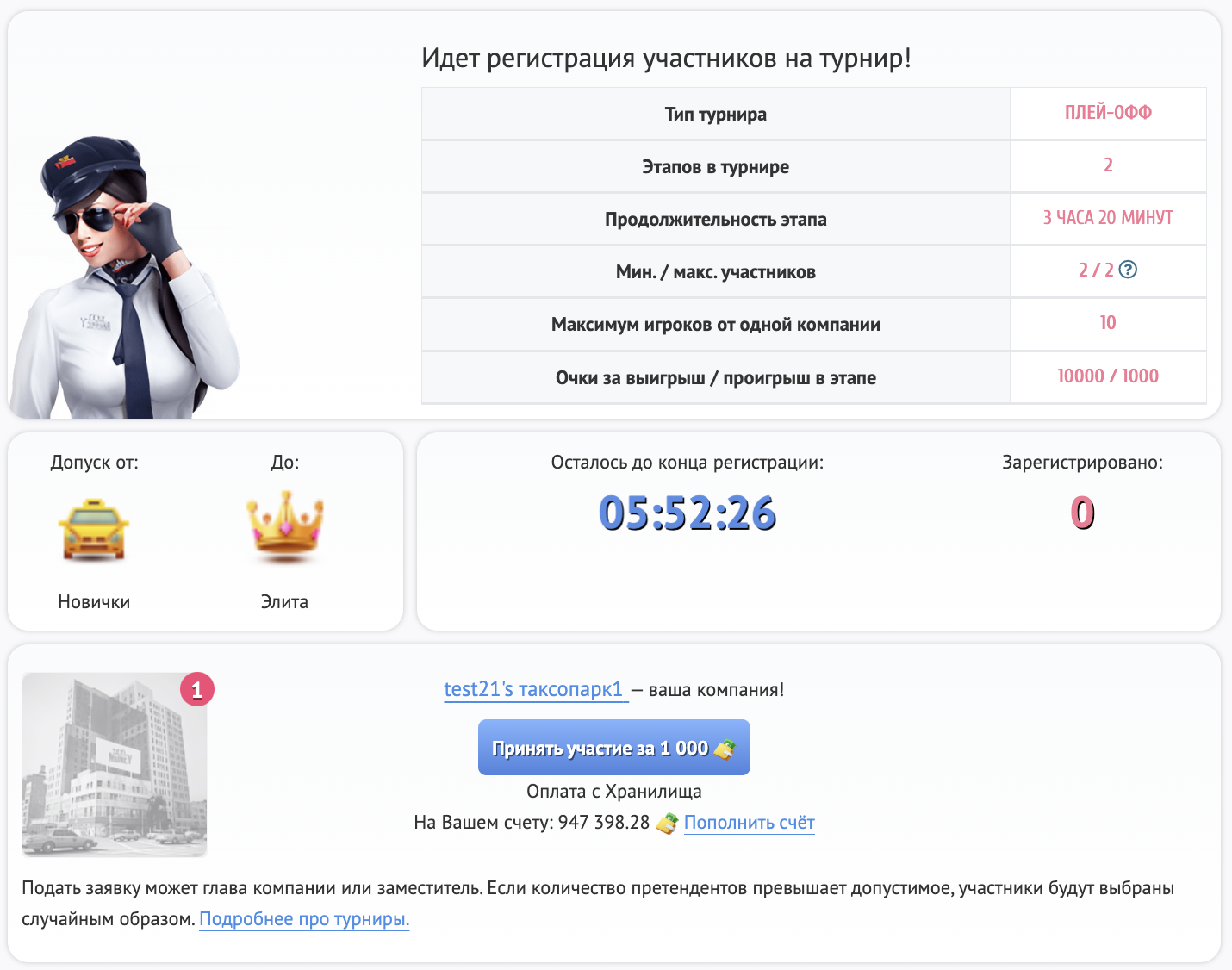 1. Регистрация в турнире: Зарегистрироваться для участия в турнире может Владелец компании или его заместитель. Регистрация для участия в турнире открывается задолго до его начала.