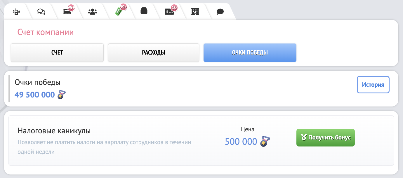 Нажмите на кнопку «Получить бонус». Если у Вас достаточно Очков победы, выбранное улучшение будет применено к Вашей Горной компании.