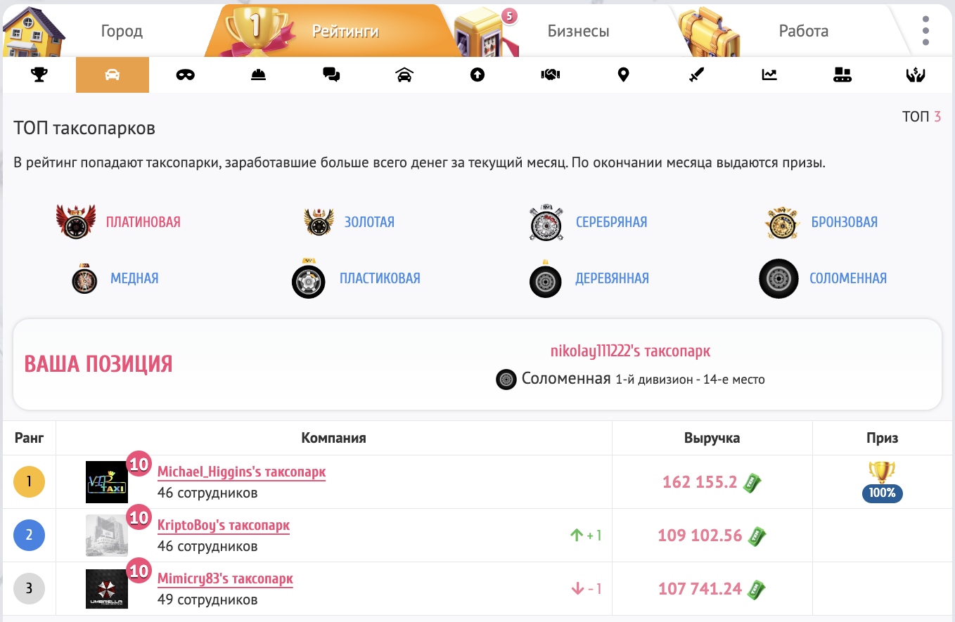 • Прокачивать Ваш Таксопарк/Горную компанию. В турнирах участвуют компании всех рангов, а значит шансы на победу у компаний с более высокими рангами выше, чем у остальных, так как у них в штате находятся сотрудники с техникой, которая зарабатывает больше.