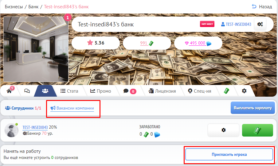 Создайте вакансию или отправьте личное приглашение игроку! Сделать это можно на странице бизнеса, в вкладке «работники».