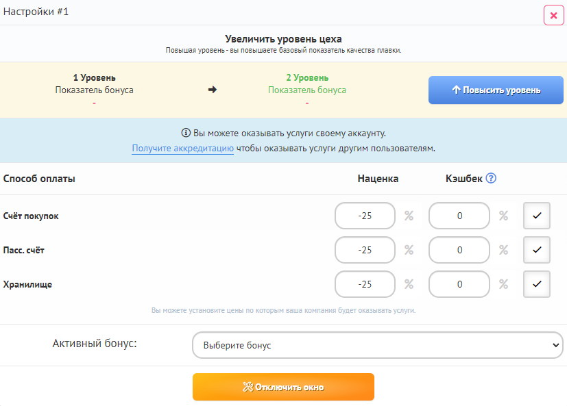 Для увеличения уровня цеха воспользуйтесь зелёной кнопкой со стрелкой в блоке соответствующего цеха или синей кнопкой «Повысить уровень» на странице настроек цеха.