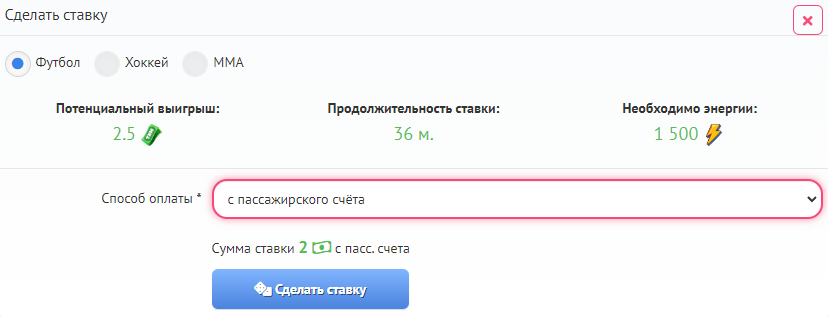 4. Выберите вид спорта и способ оплаты ставки — через счёт покупок или пассажирский счёт.