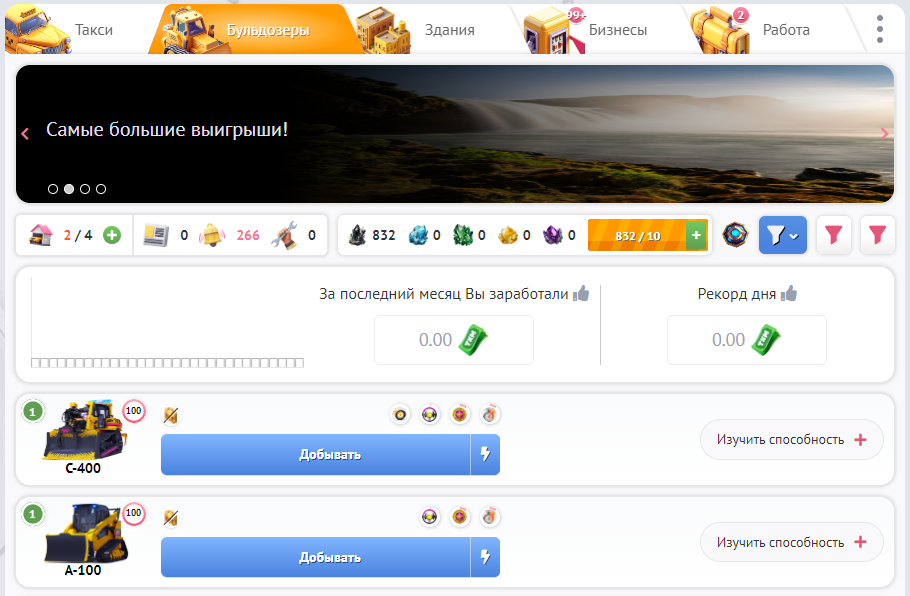 Чтобы взять заказ на добычу руды бульдозером, откройте страницу «Гараж». Далее переключитесь на вкладку «Бульдозеры» и нажмите на кнопку «Добывать» рядом с каким-либо из Ваших бульдозеров.