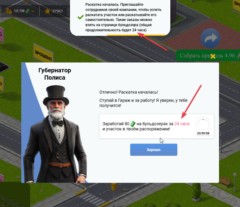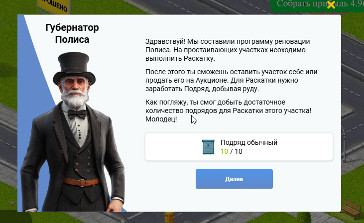 Если Вы не успеете раскатать участок за 24 часа, то участок останется в полисе, а Ваши подряды сгорят и любой другой игрок сможет начать раскатку этого участка.