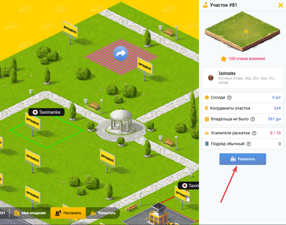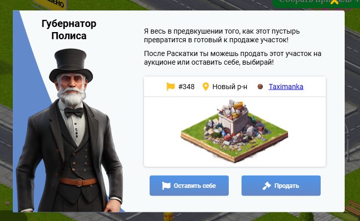 В Полисе есть участки земли, собственники, которых давно не появлялись в полисе. Такие участки отмечены специальными табличками. Раскатывайте эти участки и забирайте их себе или продавайте на аукционе и получайте прибыль!