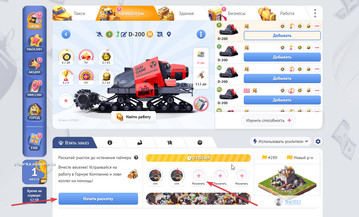 После того как Вы определились, что будет с участком после его раскатки переходим в Гараж и кликаем по бульдозеру. После чего Вы можете приступать к процессу раскатки кликнув “Начать Раскатк” или “Раскатать”.
