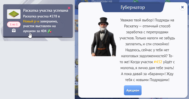 После того, как Вы успешно завершили Раскатку участка перед этим выбрав путь его продажи на аукционе и сделав все настройки: