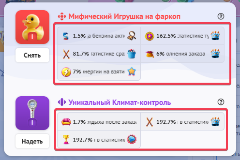 В “меню тюнинг” и вкладке инфо  будут отображены Ваши бонусы от вещей по типу заказа, которые Вы наденете после того, как добудете их с заказов например: Вы выбили себе вещь, которая дает “увеличение скорости извоза” у заказа типа “Поиски”
