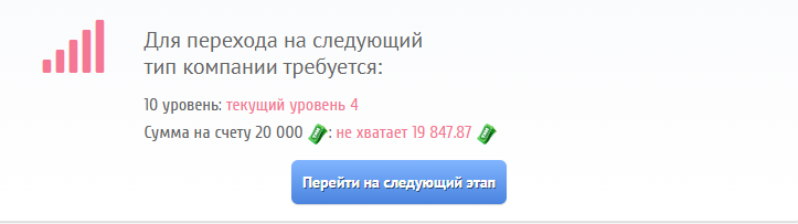 Для перехода на следующий ранга компании необходимо выполнить определённые условия перехода. Условия можно посмотреть в личном кабинете компании. Кнопка повышения находится слева от настроек компании.