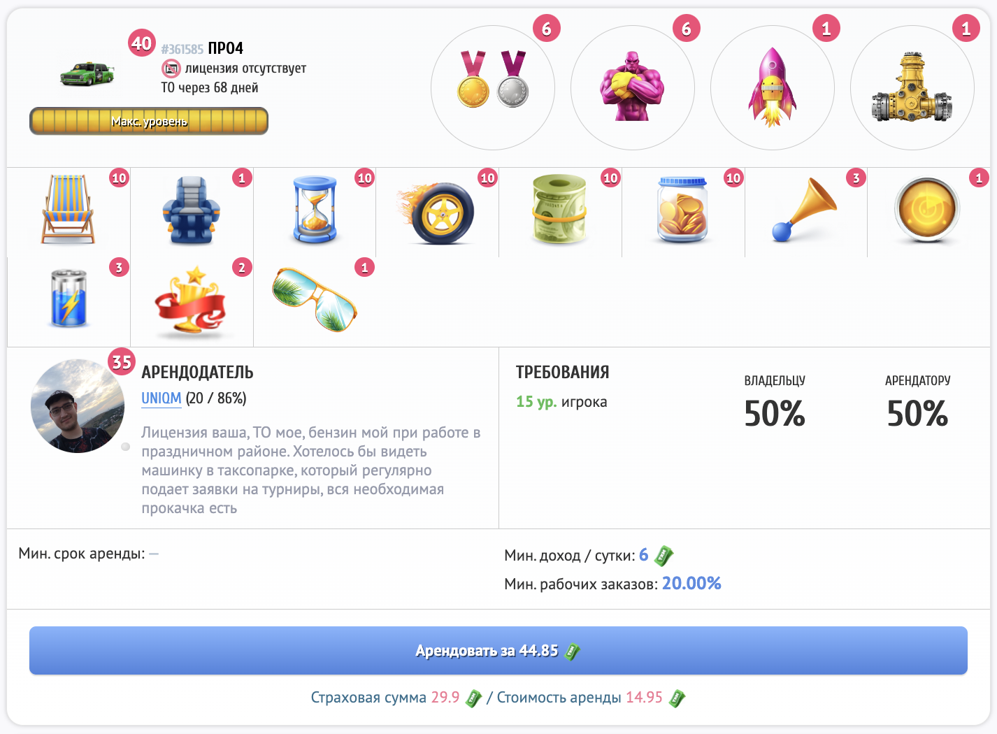 Начните свой маленький бизнес 一 сдайте своё такси или бульдозер в аренду другому игроку и наблюдайте, как стремительно растёт ваш пассивный доход. И зарабатывайте еще больше, увеличивая свой гараж.