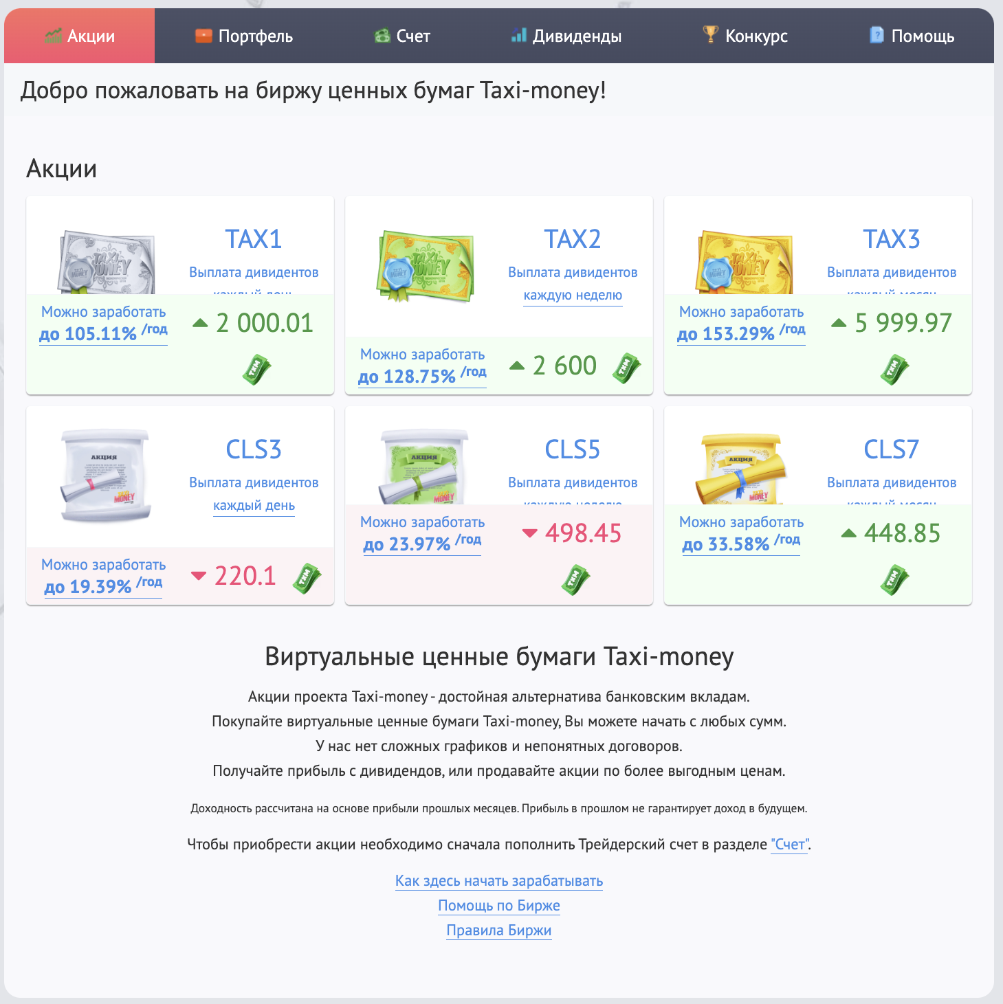 Акции проекта Taxi-money на Бирже – достойная альтернатива банковским вкладам. Покупайте виртуальные ценные бумаги Taxi-money, начав с любых сумм.