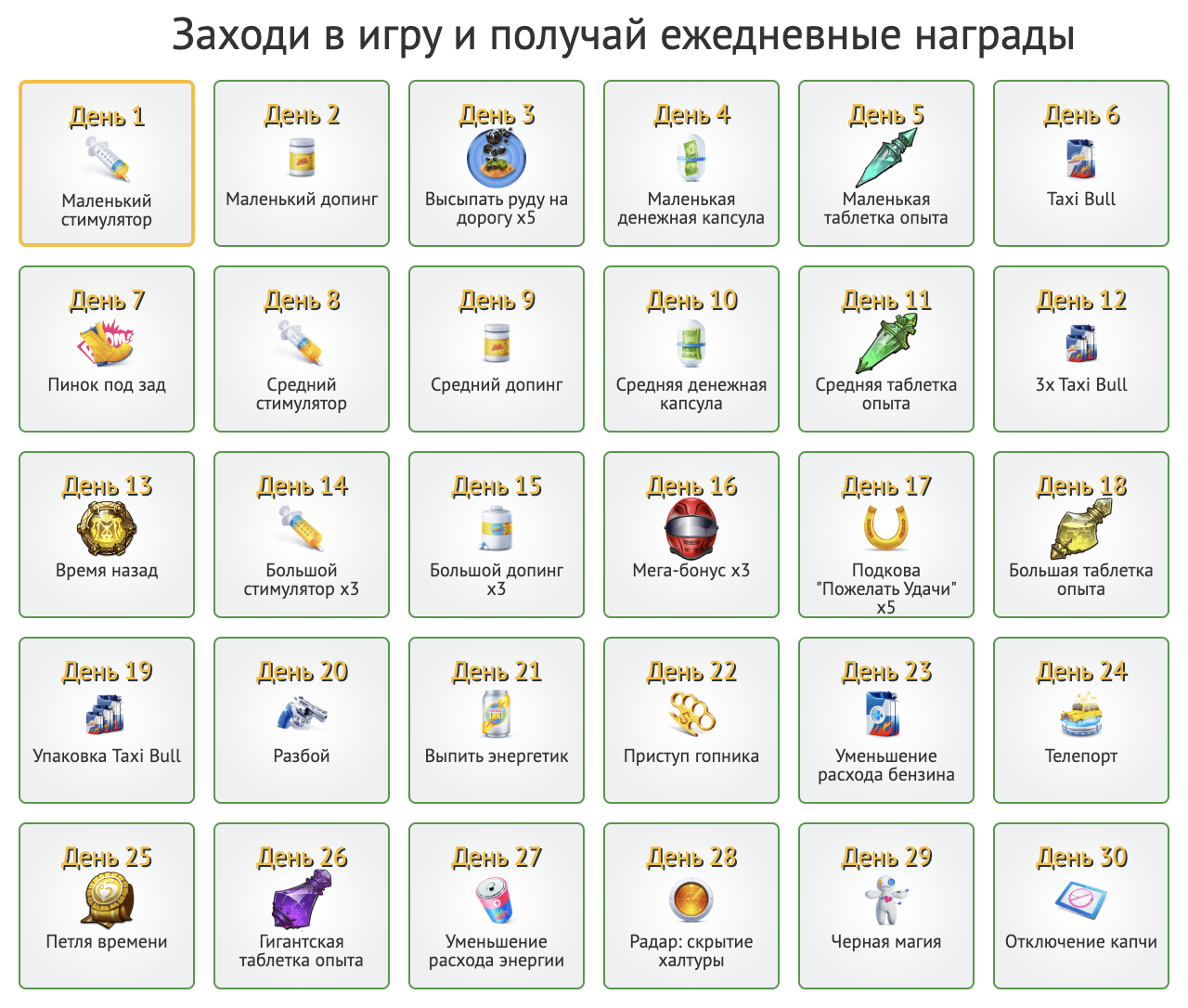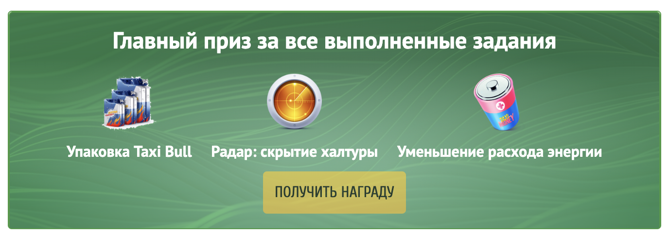 31 июля среди всех владельцев бонусного такси Бумер игра случайным образом выберет 10 счастливчиков, которые разделят призовой фонд в 90 000 рублей! Присоединяйтесь! Чем больше у Вас такси данного типа, тем выше Ваши шансы на выигрыш!