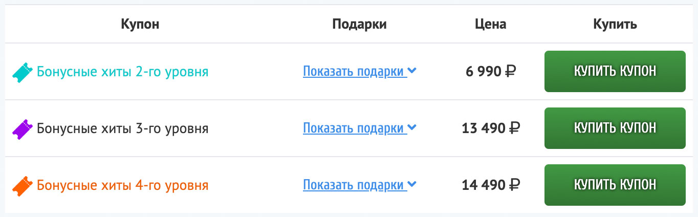 | Сумма пополнения | Получаемые бонусы |