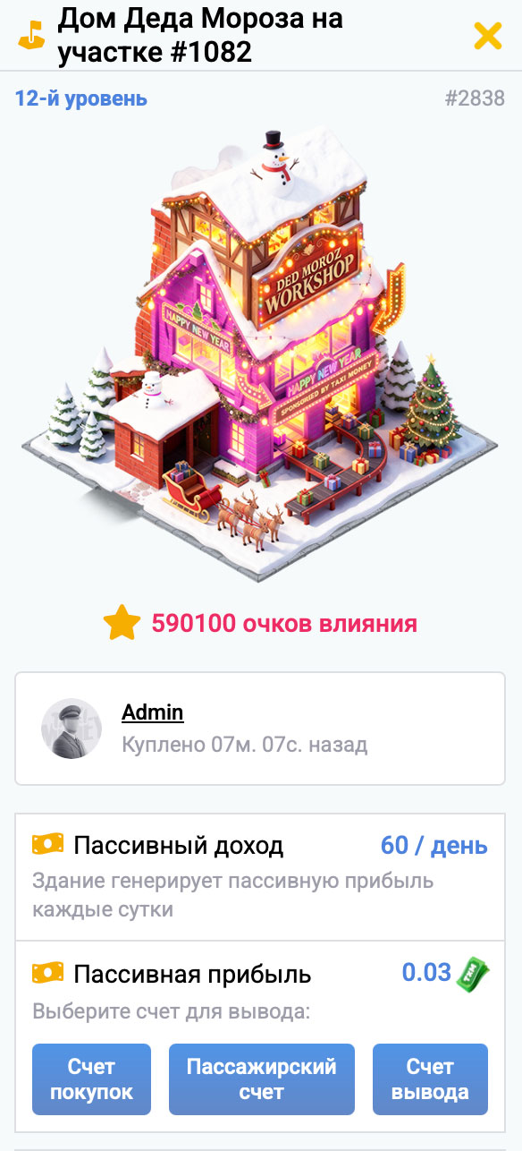 Прокачивай свой Дом Деда Мороза до нужного уровня и получай тот пассивный доход, который тебя интересует! Доход от этого здания можно получать на любой из игровых счетов!